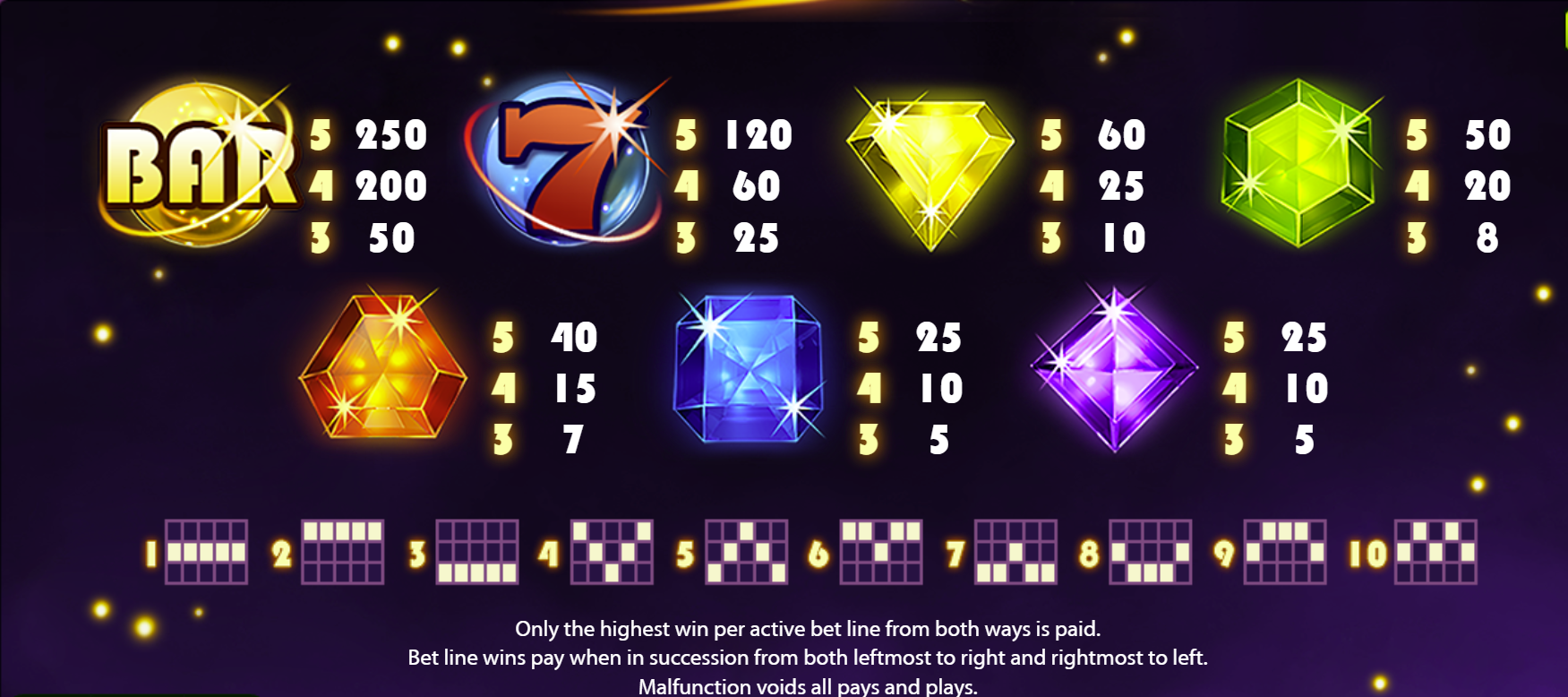 Visually, Starburst still looks impressive today. The gem symbols shine with bright colors, and the space background creates an immersive setting. The music is relaxing and atmospheric, perfect for comfortable gaming sessions.